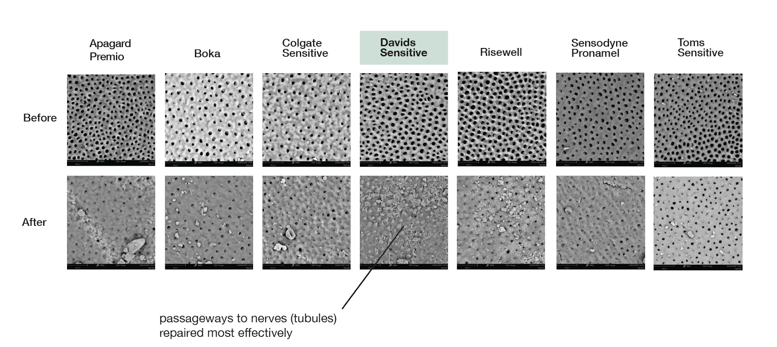But you don’t have to take our word for it! We sent samples of Hydroxi™ (and other competing products) to a trusted third-party lab, and the results speak for themselves. All photo and numerical evidence revealed that Hydroxi™ repaired the enamel more effectively than the other products. It plugs exposed passageways that lead to your tooth’s sensitive center nerve.