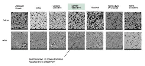 In fact, our lab results proved thatDavids Sensitive + WhiteningNano-Hydroxyapatite Toothpaste outperformed six leading competitors (Apagard Premio, Boka, Colgate Sensitive, Risewell, Sensodyne Pronamel, and Toms Sensitive). Our formula effectively remineralizes the tooth’s enamel better than the rest...check out the results for yourself!